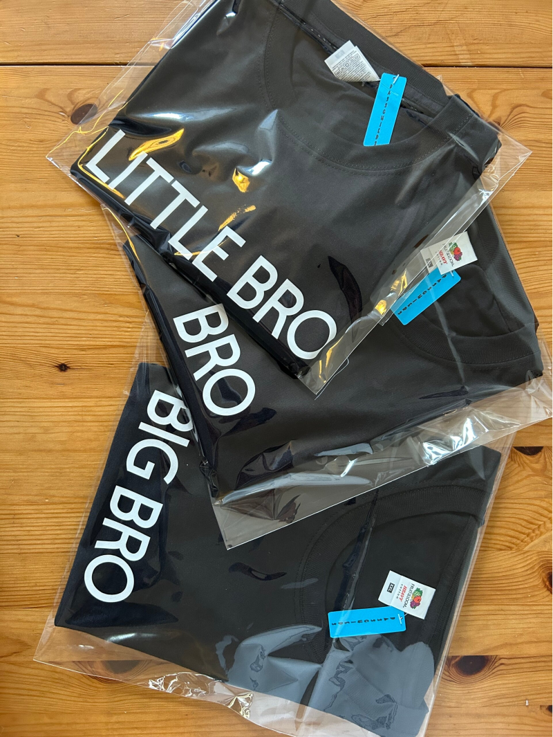 T-shirt maat S met LITTLE BRO, T-shirt maat XL met BRO en een T-shirt maat XXL met BIG BRO.