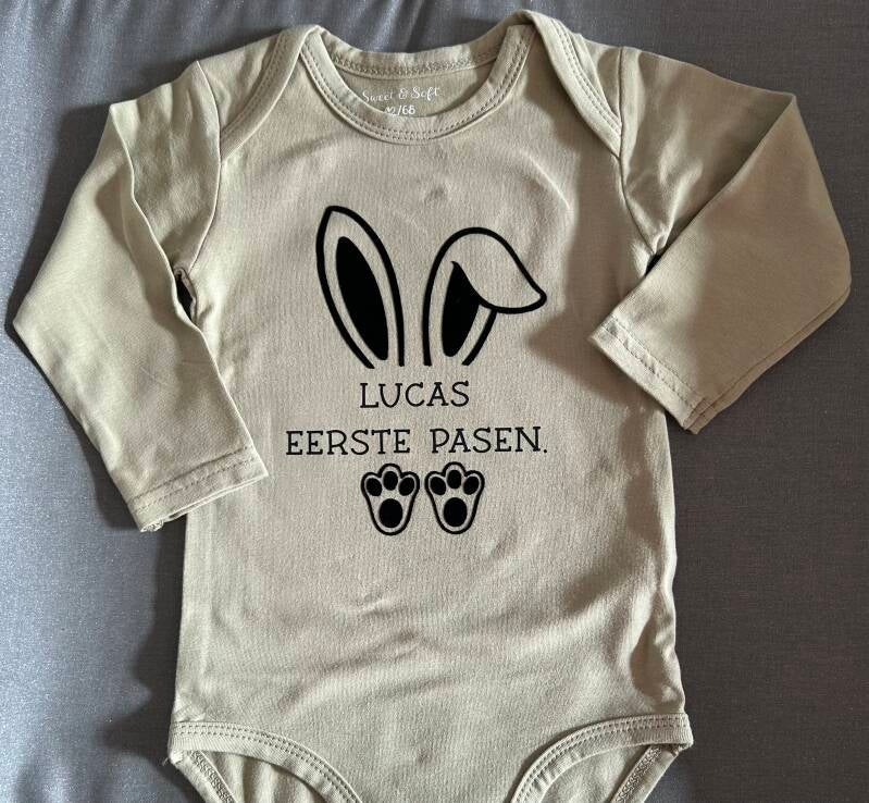 Een leger groene romper maat 62/68, bedrukt voor Pasen.